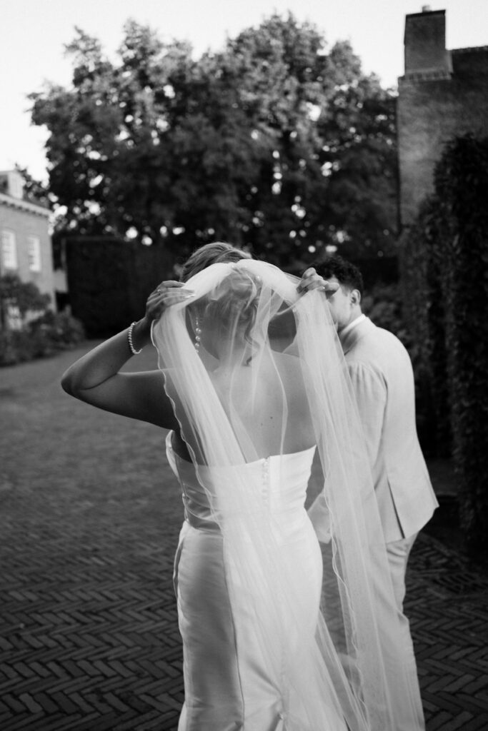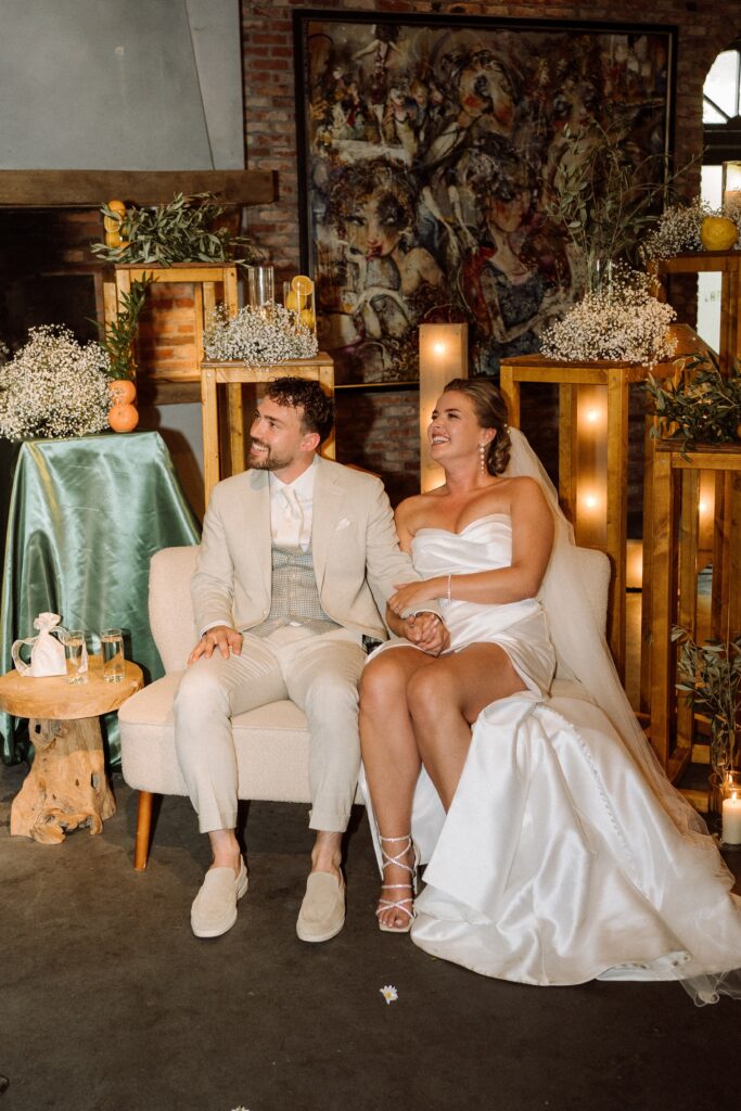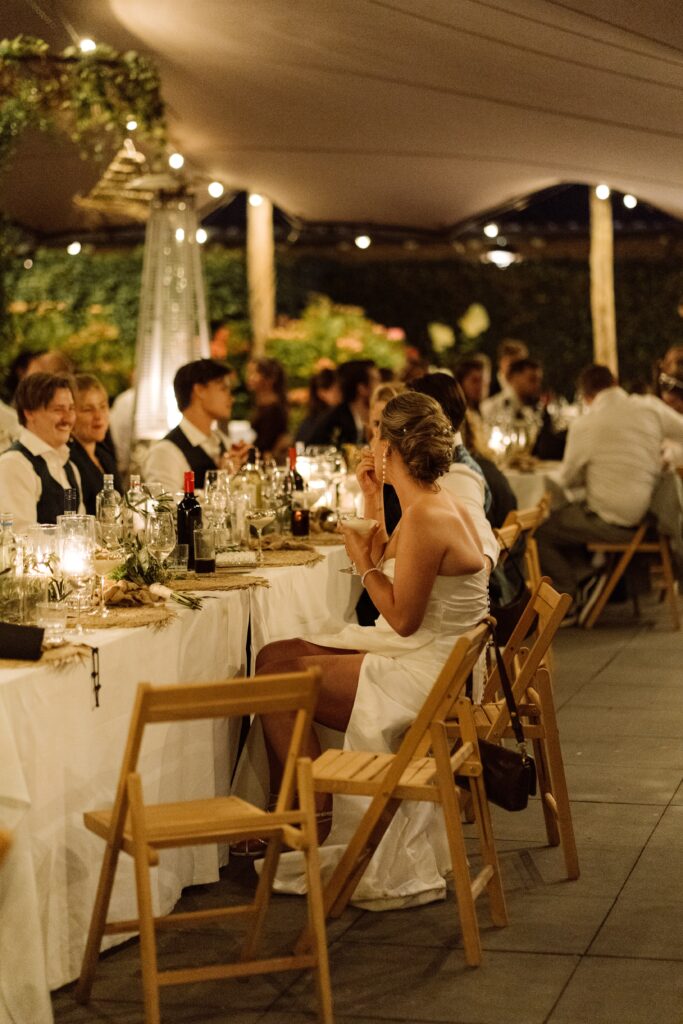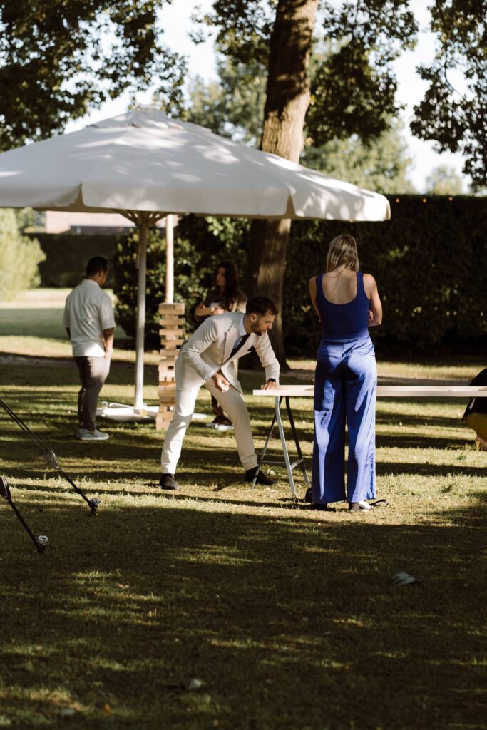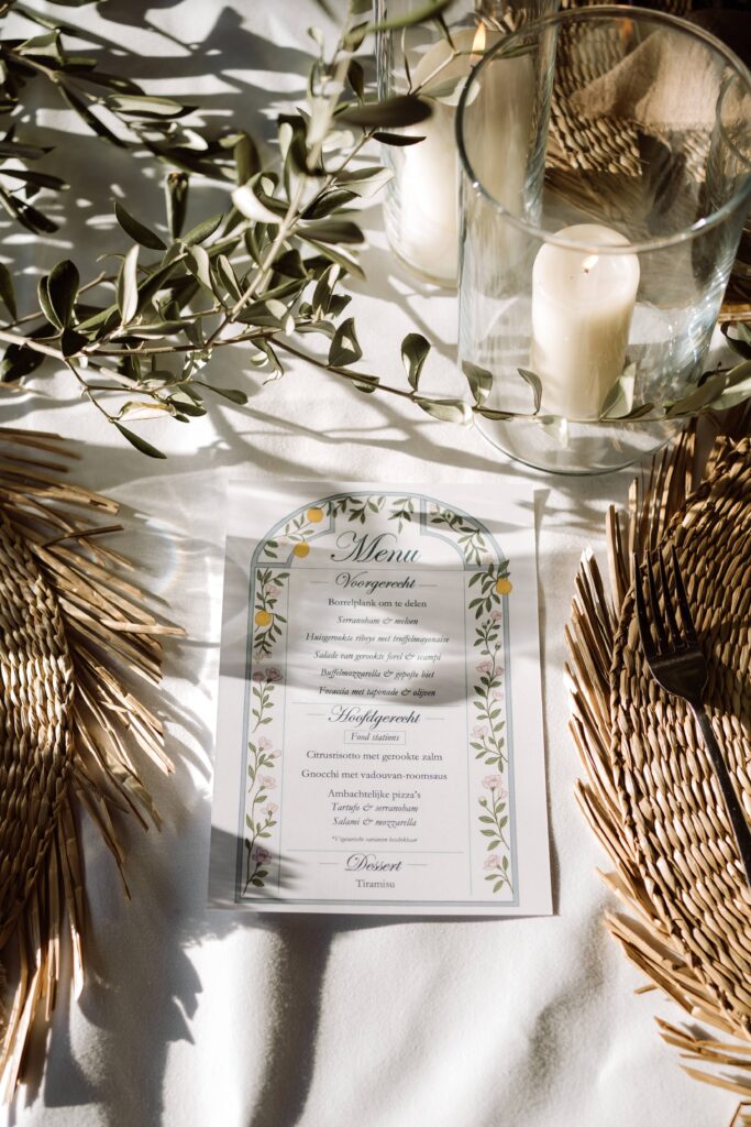 Een bruiloft op een kasteel met inspiratie uit Italië. Gipskruid, olijventakken, kaarsen, doeken, citroenen en Aperol. Het regende hard, maar vlak voordat de gasten arriveerden brak de zon door. Wij bouwden snel de ontvangst en de bar op. De ceremonie vond binnen plaats waar doeken een luxe look creëren, romantisch licht door alle kaarsen en de citrusvruchten gaven het een mooie kleur. In de tenten buiten hingen groene planten en rieten kappen, de gasten speelde spellen op de XL spellen en hadden een aperol en cigar bar. Het uitgebreide diner vond plaats onder de tent met groen op tafels en vol met kaarsen. De feestzaal werd omgebouwd en hing vol met discoballen en gipskruid.