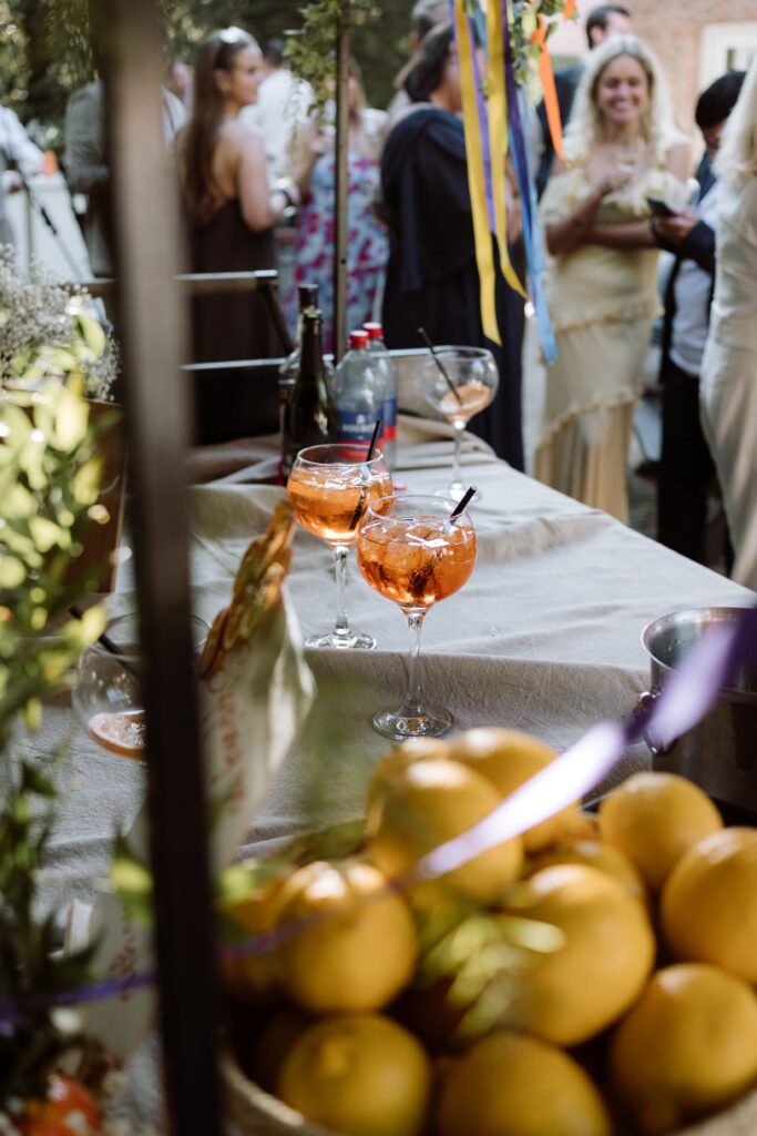 Italiaans geïnspireerd thema met een Aperolbar, natuurlijke kleuren en gipskruid.